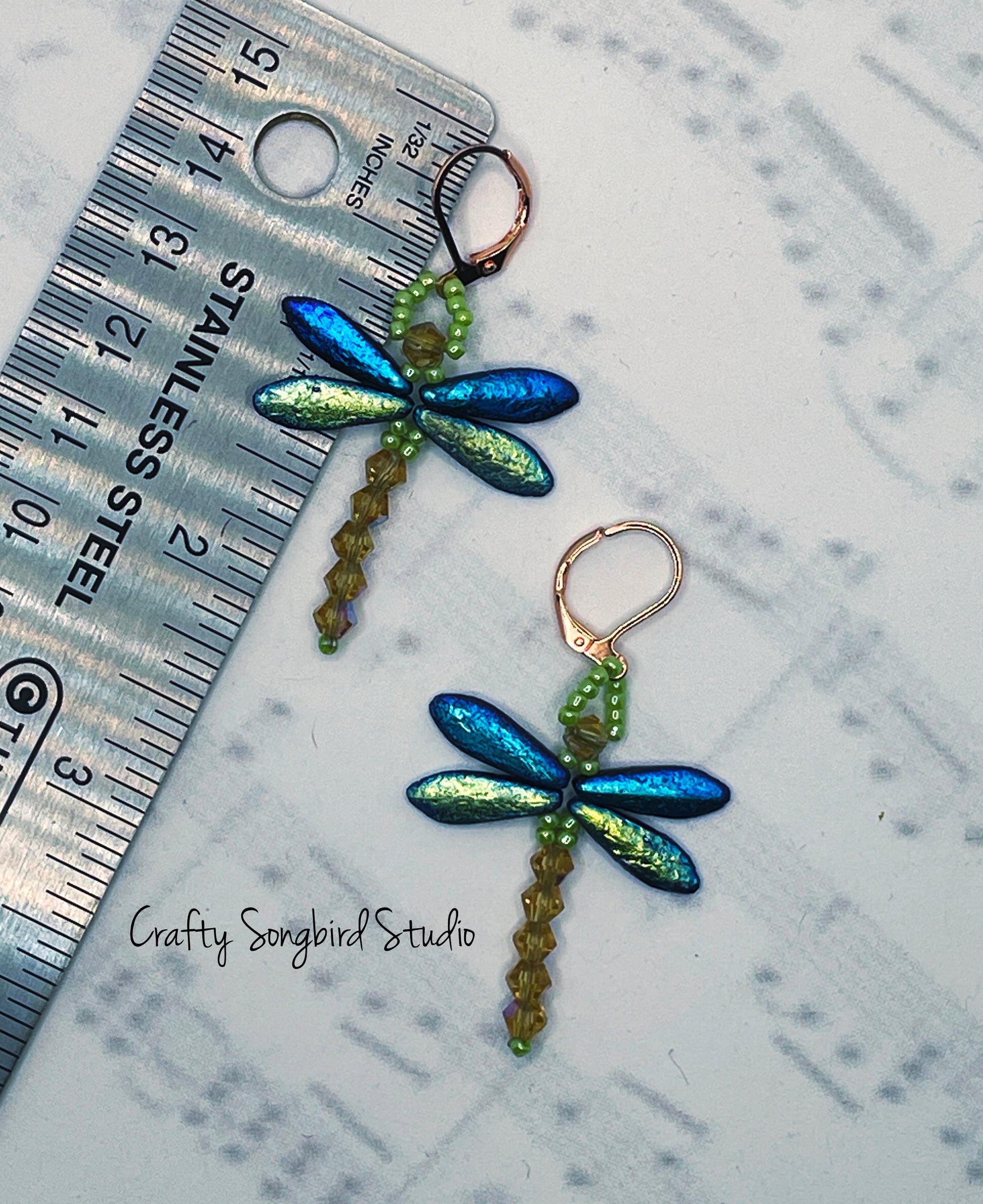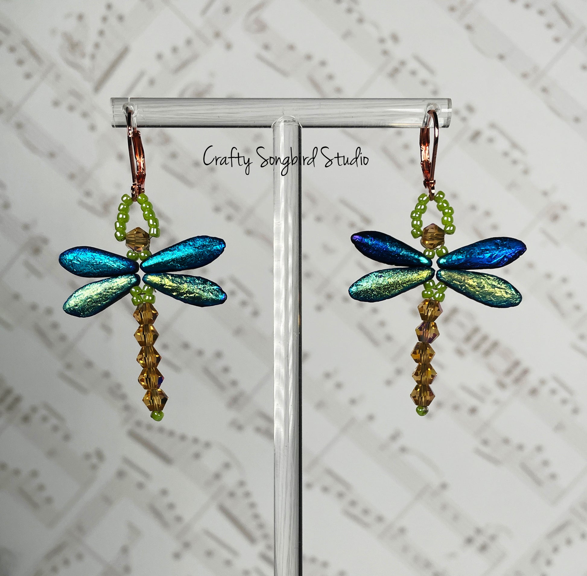 This sweet little dragonfly will stay with you forever. Its iridescent blue and green wings pair beautifully with a light topaz faceted body and light green accents.