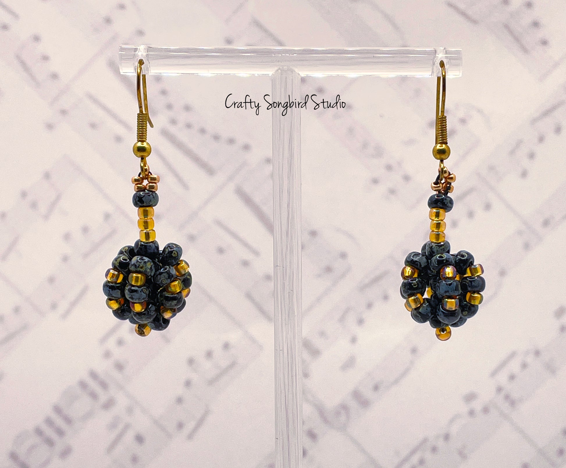 Fun little orbs to dangle from your ears. Made with Japanese seed beads in black, gray and gold.