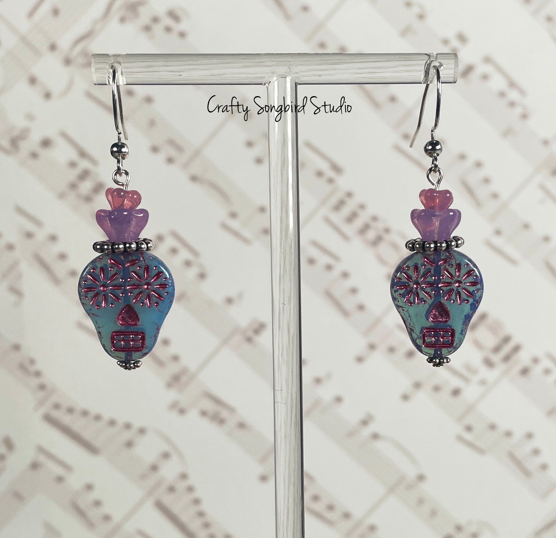 Blue Opal and pink glass sugar skulls topped with a crown of pink glass flowers.